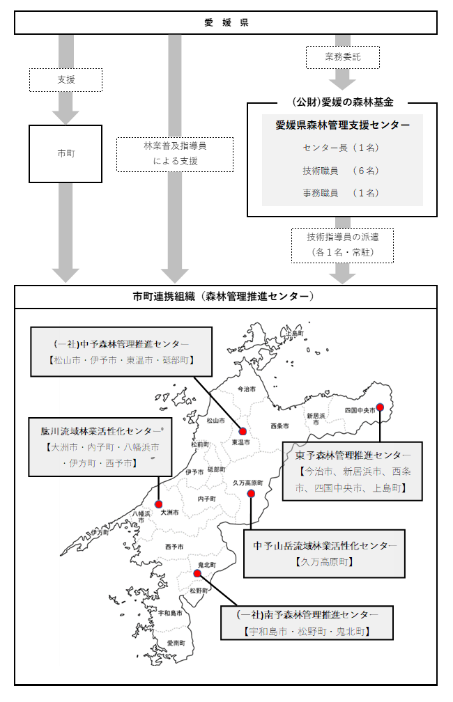 愛媛県森林管理支援センターは、平成31年4月1日に施行された森林経営管理法に基づく森林経営管理制度の中心的役割を担う市町を支援するため、愛媛県からの委託に基づき公益財団法人愛媛の森林基金内に設置されました。